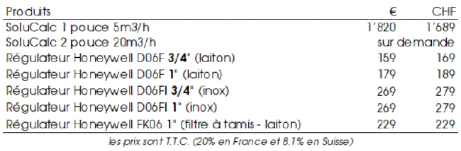 Frais de déplacement Des frais de déplacement pourront être facturés en cas de distance supérieure à 25 km à parcourir pour l'installation et la mise en service depuis Genève/Lausanne (installation en Suisse) ou Douvaine (installation en France). Forfaits livraison CO2, contrôle, réglage Divers forfaits permettent à nos clients de se faire livrer et installer une bouteille en remplacement à domicile ainsi que de faire effectuer un contrôle et un réglage de leur installation. Prière de nous demander pour les tarifs qui varient en fonction du pays et du lieu de domicile. Garantie Les adoucisseurs SoluCalc, les accessoires et les régulateurs de pression Honeywell sont garantis par les fabricants respectifs pendant la durée légale habituelle de deux ans. Les adoucisseurs SoluCalc sont en plus garantis trois ans supplémentaires par le fabricant contre tout défaut ou vice de fabrication, pièces et main-d'œuvre de réparation, au domicile du fabricant. Même une panne d'usure de l'électrovanne est garantie pendant cinq ans, l'électrovanne que nous utilisons ayant une durée de vie annoncée par son fabriquant de 100 millions de cycles. Retour Tout client dispose d'un droit de retour d'un mois en cas d'insatisfaction concernant l'existence de calcaire, sauf si cela est du à un mauvais réglage. Dans ce cas, l'adoucisseur SoluCalc devra être démonté et remplacé par un tuyau de longueur correspondante. Les frais de plombier d'installation initiale ou de démontage, les frais d'expédition ou de déplacement ne pourront pas être remboursés. Partager un adoucisseur SoluCalc Vous êtes dans un immeuble ou maison jumelle, un adoucisseur SoluCalc peut s'installer et être utilisé en commun, par plusieurs habitations. Sa capacité le permet facilement et, contrairement aux adoucisseurs (à résine/sel), la qualité de l'eau n'est pas altérée, ce qui fait que l'installation commune est légalement possible. Évidemment, tous les avantages offerts sont encore plus économiques. Parrainages Vous avez fait l'acquisition d'un adoucisseur SoluCalc est vous en êtes satisfaits. Faites profiter de votre expérience à vos voisins proches, les habitants de votre commune et des communes alentour, vos amis et parents, car ils ont souvent les mêmes problèmes de calcaire que vous. Demandez-nous des prospectus/dépliants, remettez-les leur et pour chaque vente provoquée par vos soins, une commission intéressante vous sera reversée. Achats groupés Profitez d'un rabais en cas d'achat groupé de plusieurs adoucisseurs SoluCalc pour vous, vos amis et parents et vos voisins proches ou alentour. Demandez-nous des prospectus/dépliants et réduisez aussi vos frais d'installation et, par la suite, de livraison de CO2. N.B. Seuls le prix et les conditions de vente convenus sur le bon de commande puis sur la facture font foi. |